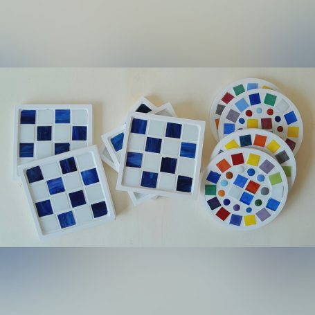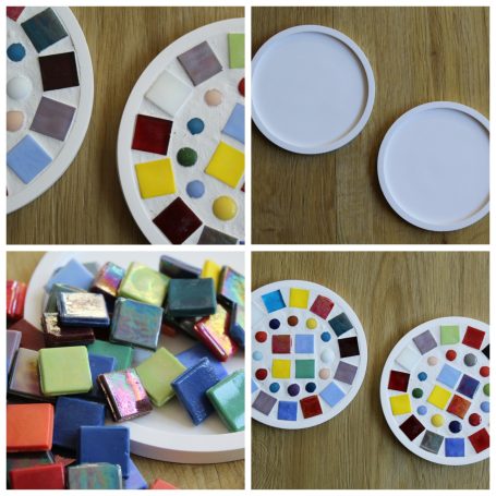 Zur Verfügung stehen verschiedene Untersetzer und eine große Auswahl an Mosaik-Steinen in vielen verschiedenen Farben und Formen.